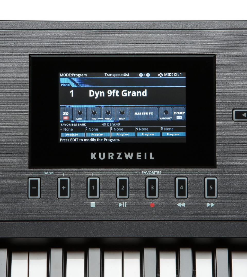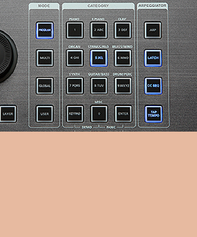 | コントローラー | 1ピッチホイール 1つのモジュレーション・ホイール 5つのスライダー 5つのノブ 6つのボタン 1つのEQオン/オフスイッチ タップテンポボタン 2つのトランスポーズ・スイッチ アープコントロール CCシーケンサーのオン/オフスイッチ トランスポートコントロール 2つのスイッチ・ペダル入力(シングルまたはデュアル・スイッチ・ペダル、またはシングル・ハーフ・ダンパー・ペダルに対応)(1つのスイッチ/サステイン・ペダルを含む、ハーフ・ダンパー・ペダルは別売り)。 コンティニュアス・コントロール・ペダル入力1系統 |