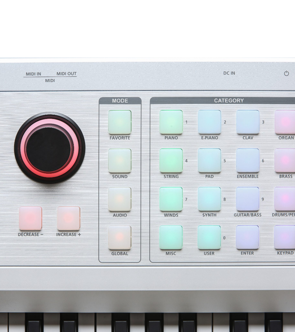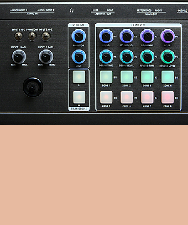 | コントローラー | 1ピッチ/Modジョイスティック 8ノブ 8ボタン 2トランスポーズ・スイッチ スイッチ・ペダル入力×2、ハーフ・ダンパー・ペダル1本対応(スイッチ/サステイン・ペダル1本付属、ハーフ・ダンパー・ペダルは別売) コンティニュアス・コントロール・ペダル入力×1(ペダルは別売) |